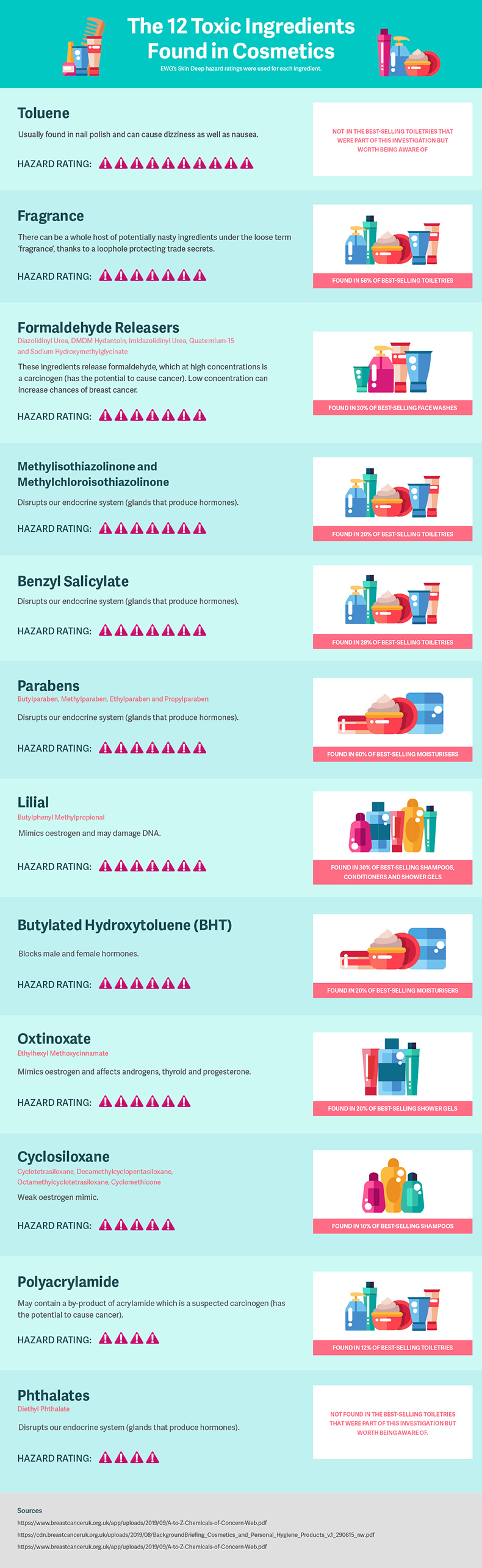Under EU legislation dangerous ingredients are banned or restricted to smaller quantities in cosmetics. However, Breast Cancer UK still recommends limiting your use of the ingredients that we’ve uncovered.